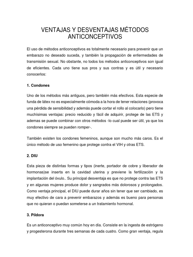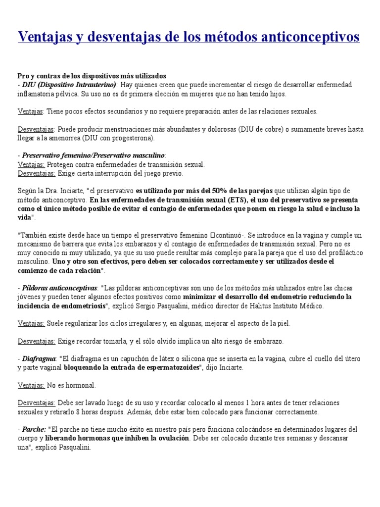 A continuación te presentamos los métodos anticonceptivos más populares para que junto a tu médico decidan cuál es. MÉTODOS ANTICONCEPTIVOS DEFINITIVOS CUALES SON LAS VENTAJAS Y DESVENTAJAS DE ESTOS METODOS. Para una práctica correcta es imprescindible seguir las instrucciones de un médico especialista. Divulgaciones Los planes de seguro médico y dentales tanto individuales como familiares están asegurados por Cigna Health and Life Insurance Company CHLIC Cigna HealthCare of Arizona Inc Cigna HealthCare of Illinois Inc. Ventajas y desventajas de los métodos anticonceptivos. Las personas han utilizado métodos anticonceptivos durante miles de años. Existen anticonceptivos que evitan que el óvulo y el esperma se encuentren para prevenir embarazos o que evitan la transmisión de enfermedades de transmisión sexual los de barreras pueden usarse para ambos casos pero debes tener presente qué tipo de protección te brinda cada método. Hoy en día tenemos muchos métodos anticonceptivos seguros y eficaces disponibles para nosotros. Pastillas de combinación parche cutáneo o anillo vaginal estrógeno más progestina Ventajas Desventajas No hay interrupción del juego sexual previo ni.