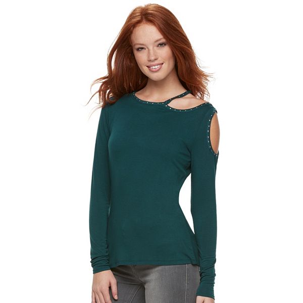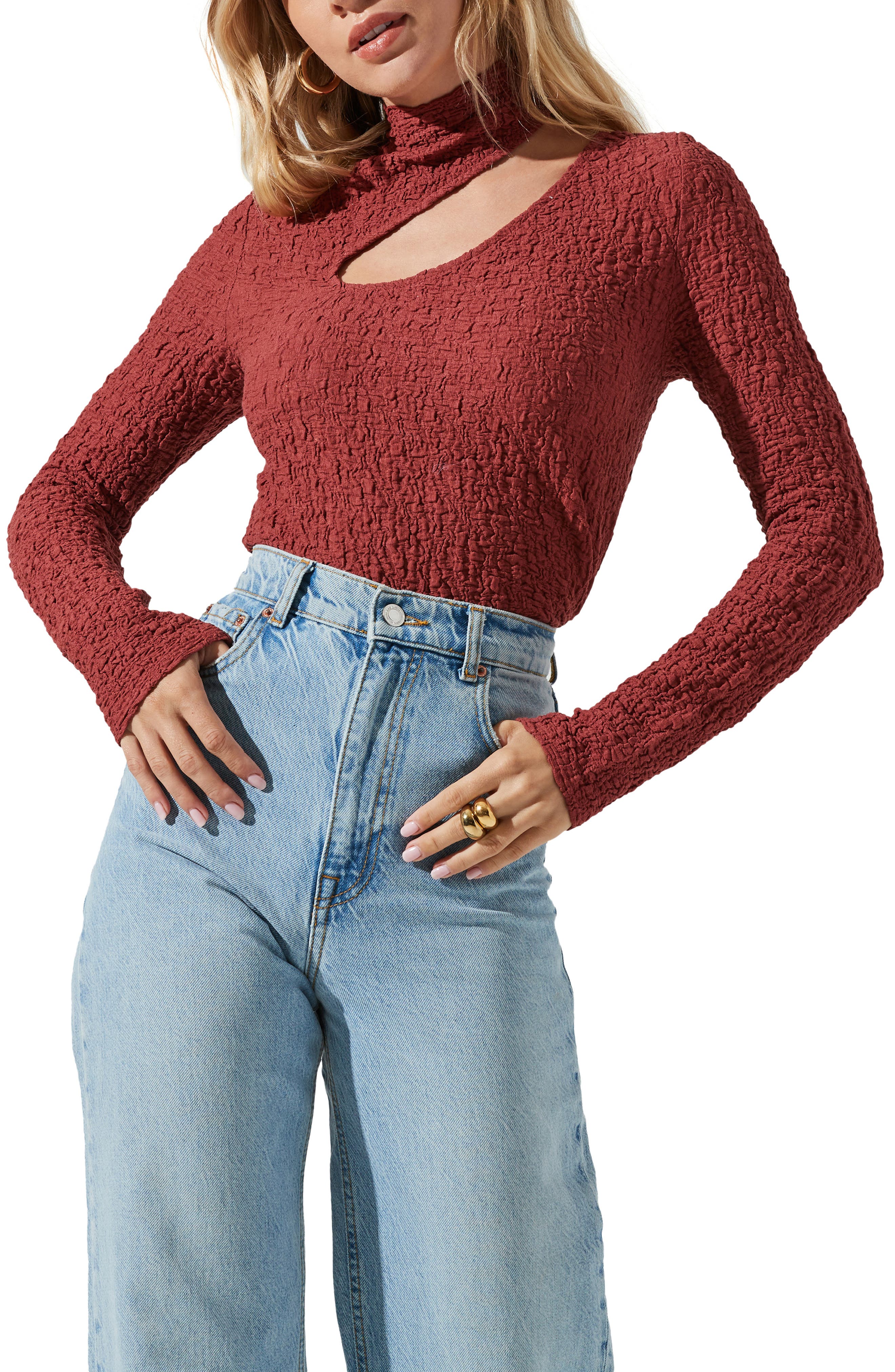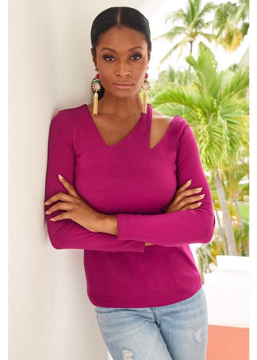 Cutout Front Asymmetrical Neck Long Sleeve Top. An asymmetrical cutout detail along the wearers left collarbone extends to the back shoulder resulting in a statement-making look. Follow the size chart to select the size.