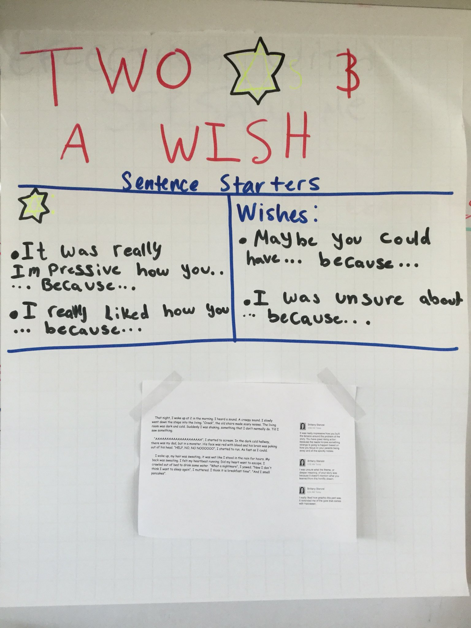 Write your completed sentences in the Two Stars and a Wish boxes. Apr 11 2019 - Two Stars and a Wish display with sentence starters.
